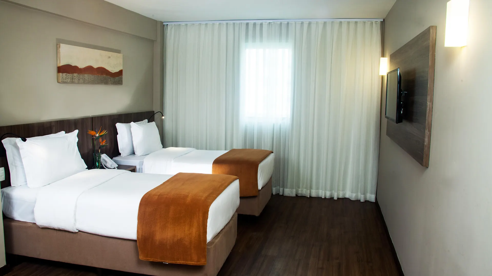 Os quartos estão equipados com mini frigobar, cofre pessoal e mesa de trabalho, bem como banheiro separado e chuveiro no banheiro.